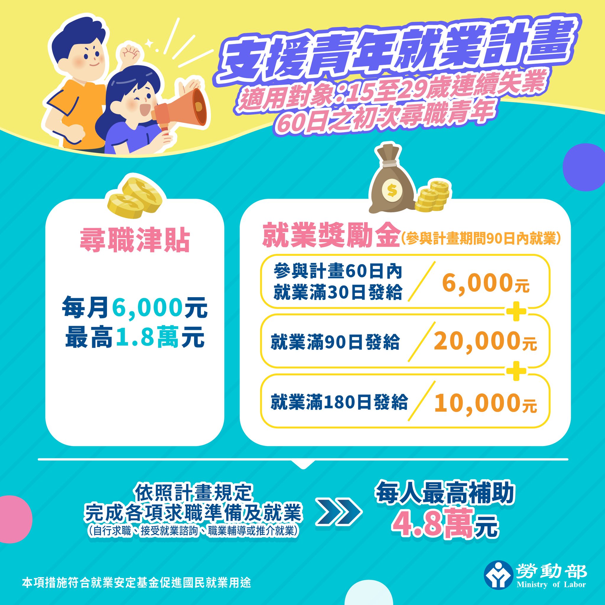 針對15至29歲未在學、未就業、連續達60日以上之初次尋職青年,於尋職期間提供最高1.8萬「尋職津貼」,倘就業成功並穩定就業滿3個月,另提供最高3.6萬「就業獎勵」,兩項合計每人最高可領4.8萬元。