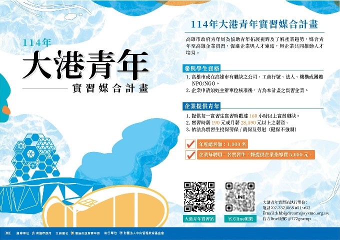 大港青年實習媒合計畫透過補助企業實習指導費,鼓勵企業提供基本工資以上之實習職缺,並建置實習媒合平台整合職缺,以媒合設籍或高雄就學的青年至在地企業實習,協助青年熟悉職場環境及累積就業經驗。