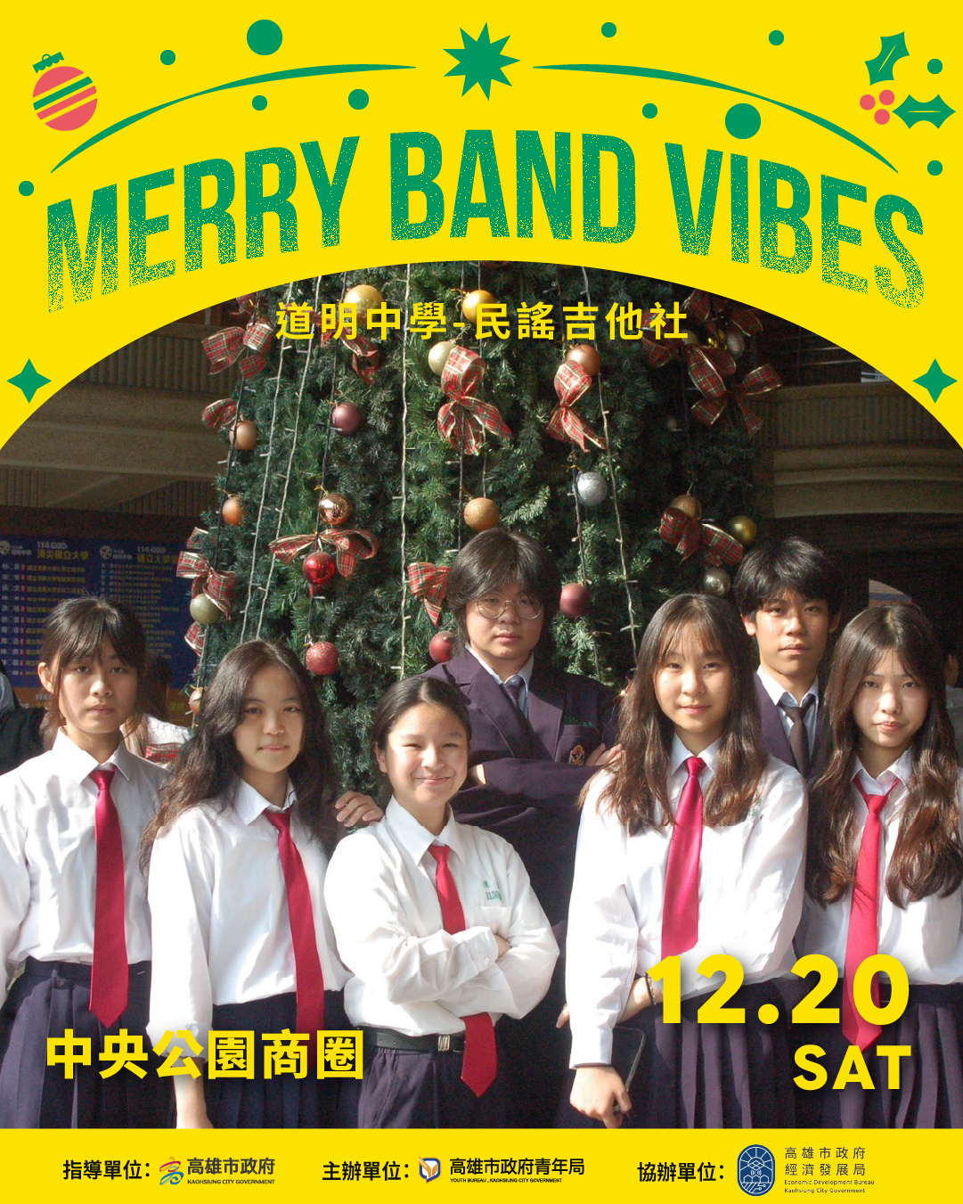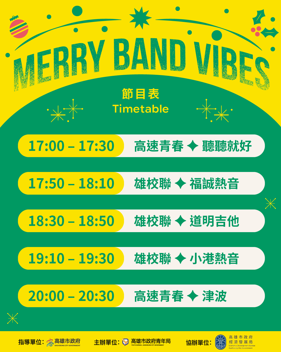 週六下午5時至晚間8時30分登場的「Merry Band Vibes」音樂展演,將由青年局「高速青春」培育樂團擔綱演出,包括「聽聽就好 Just Listen」、「津波 Tsunami」領軍開唱,並串聯「雄校聯」的校園音樂能量,由福誠高中熱音社、道明中學民謠吉他社及小港高中熱音社接力登台,以青春樂音點亮中央公園玉竹商圈,展現校園社團與城市街頭接軌的音樂動能。